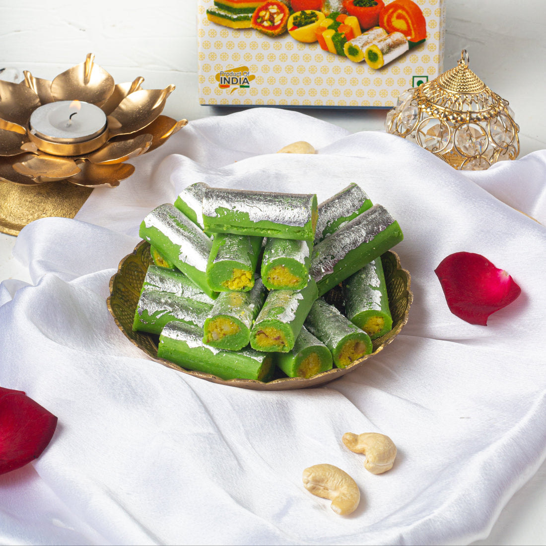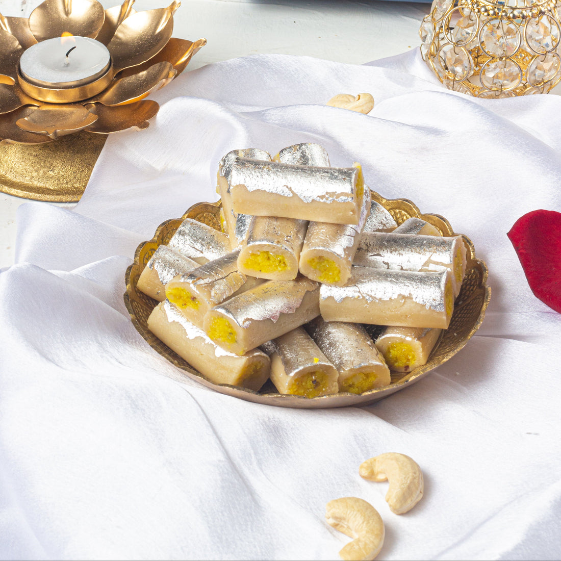 Kesar Patra Roll is a luxurious Indian sweet that combines the rich flavor of cashews...