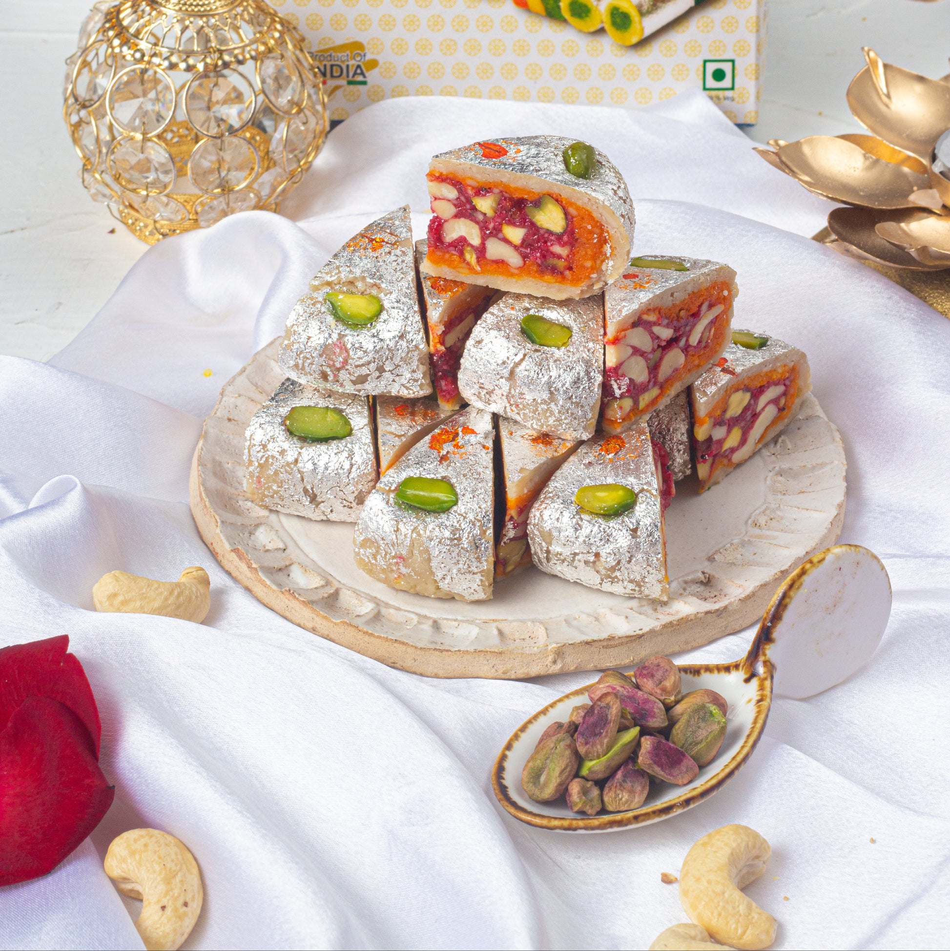 This lavish sweet is an attention seeking point for every sweet buyer these days. Finely crafted with experts from the Legacy of MM Mithaiwala outlet. Mesmerize your happy moments and elevate the festive style with the most Authentic Kaju Cake of all time.